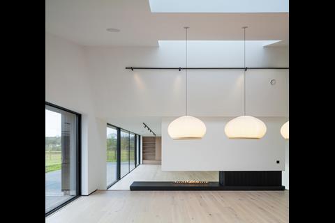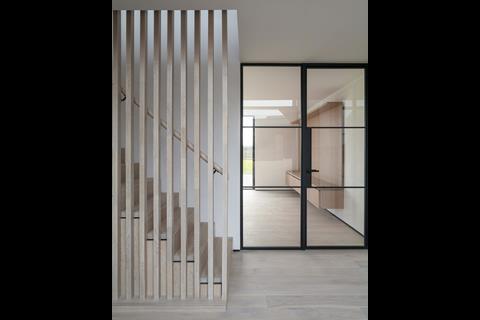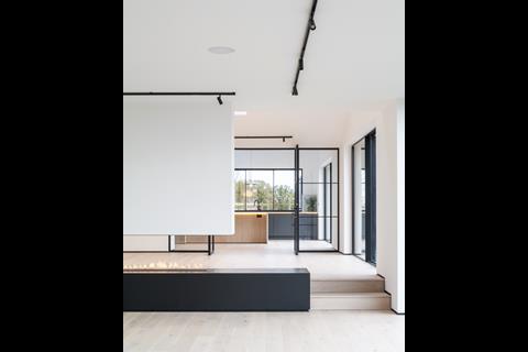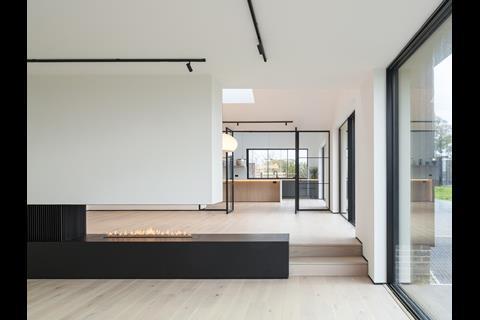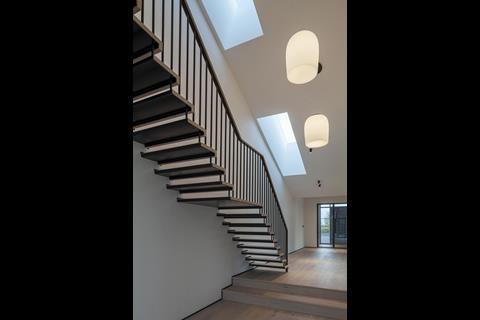 The houses are constructed from structural insulated panels with a mixture of glulam and steel beams, plus low-carbon concrete. Floor structures feature metal web joists, which use less timber to achieve the required joist strength and loading capability, while old concrete slabs and pathways were crushed for hardcore. There are air-source heat pumps, photovoltaic panels, extensive insulation, MVHR systems and electric car charging points as well as bioethanol fireplaces.