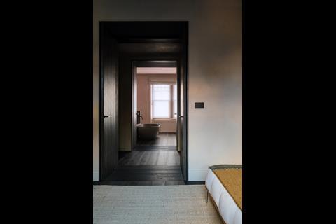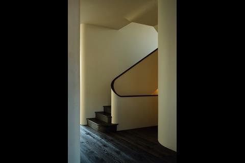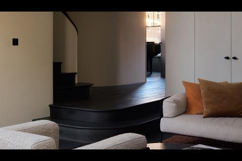 At the same time, dark oak boards, oak doors and bespoke joinery establish a coherent rhythm across the interiors. A curved plaster balustrade and sculptural solid timber handrail soften the stair core, while patinated bronze ironmongery is designed to age gracefully with use. Together, these elements create a palette that is robust, restrained and textural – chosen to withstand the energy of family life while rewarding close interaction.
