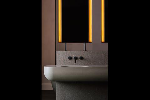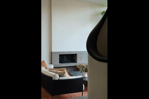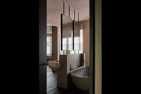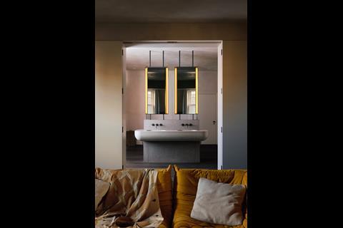 Materiality is central to the project. The name ”House of Porphyry” reflects the recurring use of porphyry stone in fireplaces and in the bathroom, where blocks of stone form a dramatic wall paired with a cast-concrete basin and bespoke brass mirrors. Porphyry is an igneous rock with a distinctive texture of large, coarse-grained crystals embedded in a finer-grained matrix. With a name originating from the Greek word for “purple,” it was historically prized as a royal stone, though it comes in a variety of colours. Due to its extreme strength and durability, it is now widely used for paving and hard landscaping. The porphyry elements anchor the interiors, bringing a sense of permanence and weight.