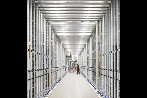 From that central void, shelving stretches up across four floors. For visitors, this means a space where stored objects are not tucked away behind glass, but placed on open pallets, sometimes – as with light-sensitive fabrics – shrouded, but mostly fully exposed.