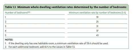For example, under updated 2022 regulations, a 75m2 three-bedroom home must meet a whole-dwelling ventilation rate of 31l/s (see table 1.3 in Part F below).