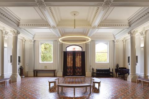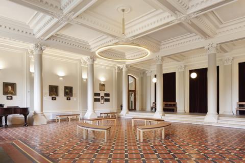 Alongside careful repair works, the Lower Hall’s sofas have been replaced by simple, more adaptable wooden benches and its castle-worthy chandelier swapped for a minimal halo of light. Architectural details, such as the deep red columns and off-pink walls, have been neutralised in shades of white that enhance their finer features. Work in this block was completed in this year’s six-week summer holidays for a budget of around £650k, Wigfall explains.