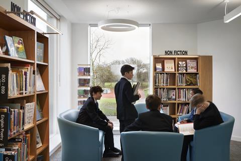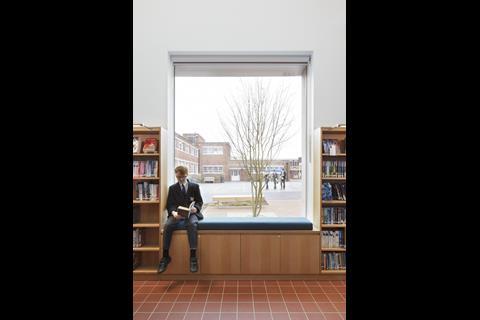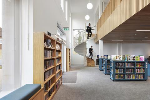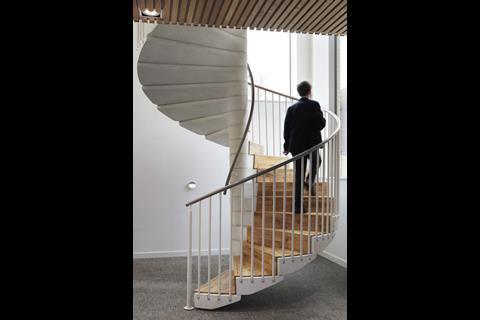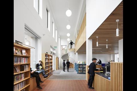 Windows are positioned to reveal glimpses of activity and there’s a flash of drama in the spiral staircase, which is a sweep of oak-topped precast concrete connecting the ground floor library with the gallery-level classroom.