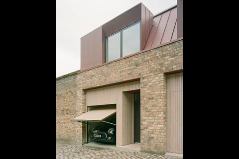 The homes use reclaimed brick found on site – a key detail being the reuse of a curved, bullnose brick at each entrance. Above rust red standing-seam zinc defines the upper storey and roofline. The garages and recessed entrance vestibules, meanwhile, are made of timber cladding – continuing a pattern of timber-clad garages on the quiet mews lane.