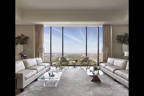 Internally, communal spaces in the building, and some of the apartment interiors, have been designed by Studio Sofield in a conservatively luxuriant style, with art deco touches. Bedrooms are mainly located on the south side of the tower, with views over Midtown, while living spaces are located to the north, looking over Central Park. The tower culminates in a series of duplexes, with lifts opening directly into the apartments.