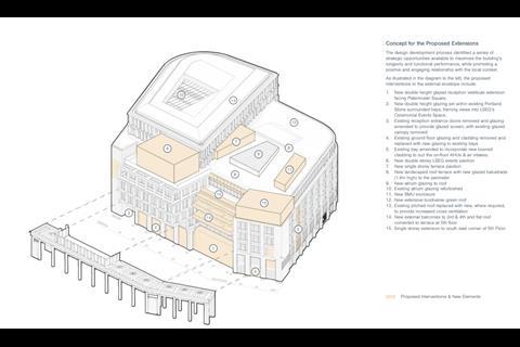 The scheme would also see the addition of several roof level extensions including a new double-height events pavilion, a single-storey roof terrace pavilion and a single-storey extension to the corner of the building.