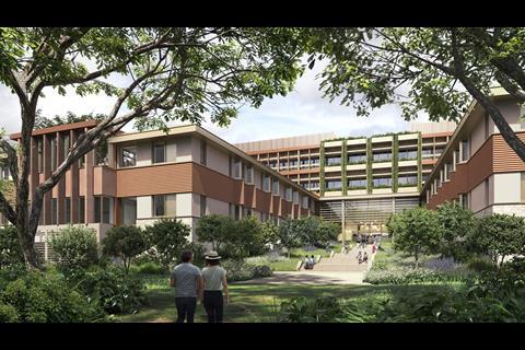 The design for the new hospital comprises four two-storey wings radiating from a central spine, with each ward arranged around landscaped courtyards.