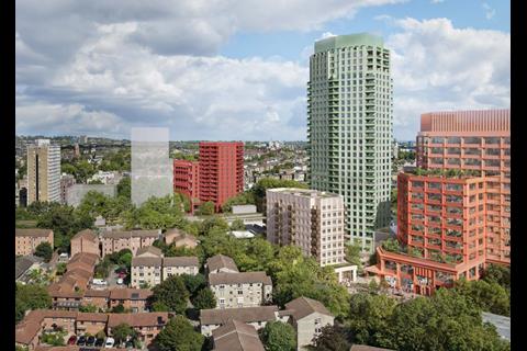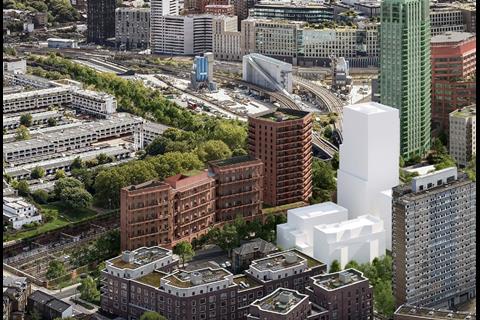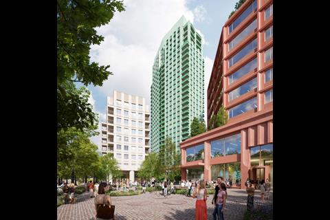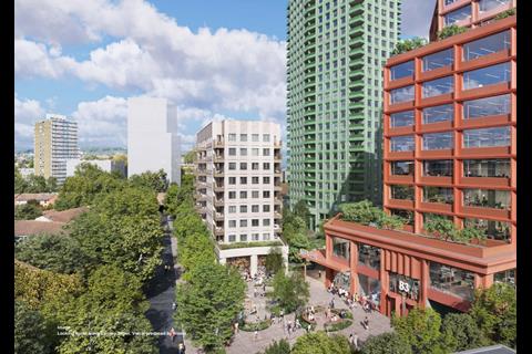 The 0.5ha northern site, designed by FCBS, would contain an interlinked mixed-use building ranging from eight to 13 storeys in height, containing 119 social rent homes on upper levels and commercial space on lower storeys.