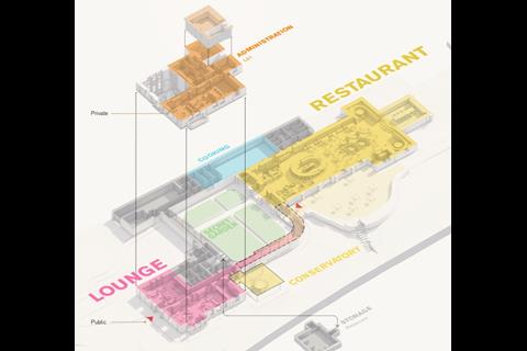 Fosters, which has also designed a landscaped route linking the restaurant to the campus, said it had sought to devise a “thoughtfully designed sequence of spaces that elevate the guest experience from the moment of arrival to the moment guests are seated at the table”.