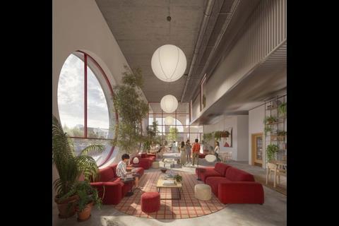 Images of the scheme show a large double-height lounge and study area for student residents on the ground floor with circular statement windows looking out onto the river.