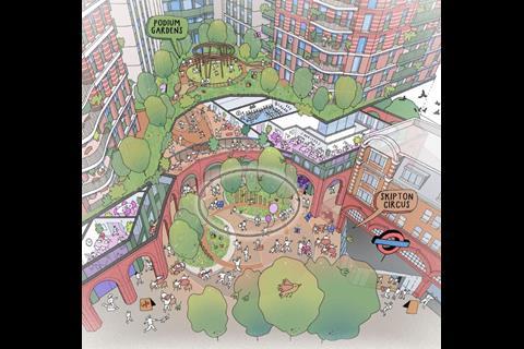 It will consist of two linked buildings, each taking the form of a pair of towers stepping up in height from 21 to 31 storeys arranged around a new central public space called Skipton Circus.