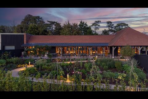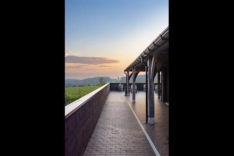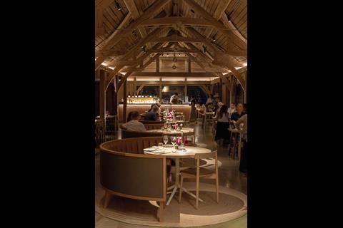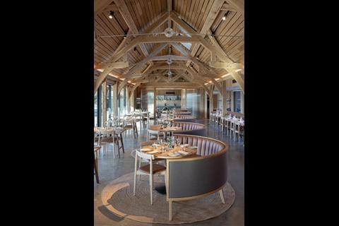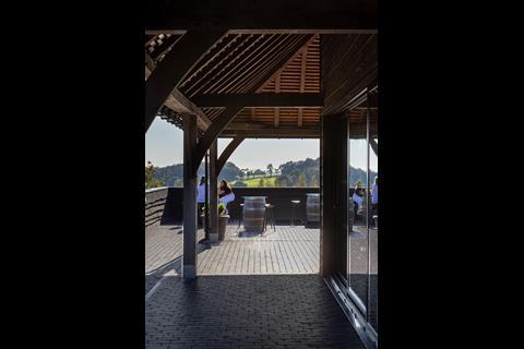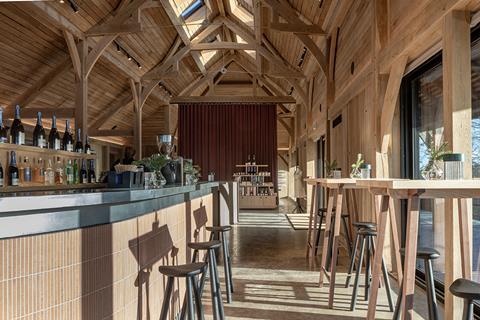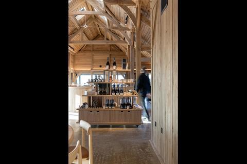 The Hambledon visitor centre is organised around a central courtyard, with a terrace offering views of the surrounding vines. A hospitality barn sits on top of wine cellars and a bottling area set into the sloping terrain. Housing a 60-cover restaurant, bar, private event spaces, tasting rooms and shop, this is made from green oak, which has a rough, agricultural quality in keeping with its viticultural setting. The furniture inside, meanwhile, is made from a more refined palette of ash and walnut.