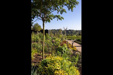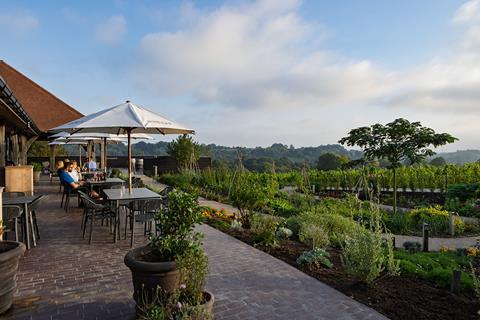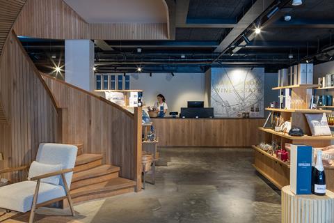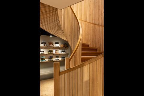 A terracotta-tiled central bar forms a focal point, and from the bar a timber staircase leads down to thea new shop that stocks local produce alongside Hambledon wines. There, bespoke retail gondola units were designed for individual Hambledon wines. A culinary garden, designed by Emily Erlam Studio, provides a fully accessible route to the restaurant, and supplies fresh herbs and vegetables for the restaurant.