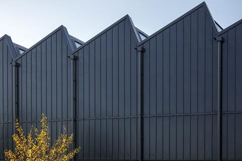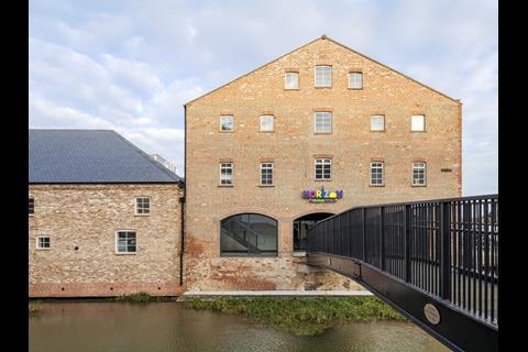 The series of Victorian structures lining the River Freshney were rebuilt and restored, while the charcoal-grey sawtooth sports hall, full-height climbing wall, performance space and teaching kitchen were provided in a 1,115 sqm new addition.