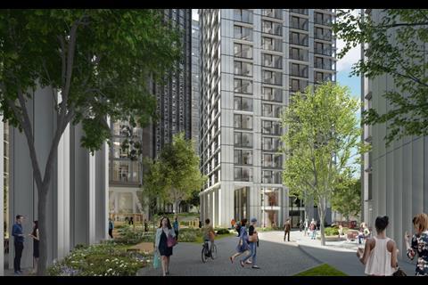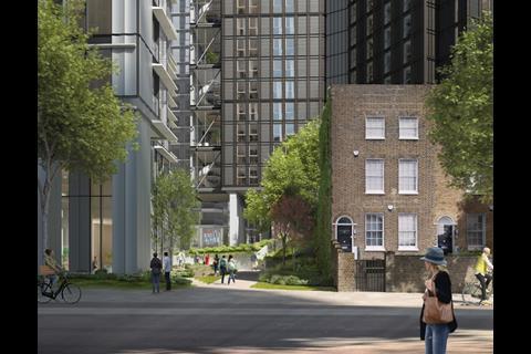 Planning documents reveal new images of the scheme’s 4,200sq m central green space, designed by Exterior Architecture, which is being billed as the “heart of a new centre for Vauxhall” with mature trees, play areas and seating.