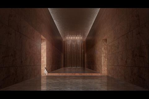 The concept is described as being embedded within the site’s geology, responding to the terrain and ancient water flows. The design seeks to evoke renewal through a tributary-like depression where water can reappear after rainfall, connecting landscape, memory and faith.