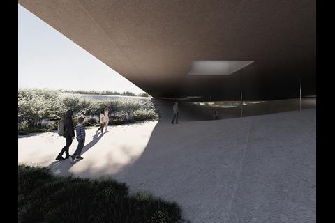The proposal takes the form of a single expansive roof following the site’s topography. The design aims to preserve the wilderness setting, shaping the landscape subtly through light and shadow, with green corridors linking the museum to the pilgrimage path.