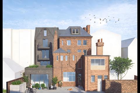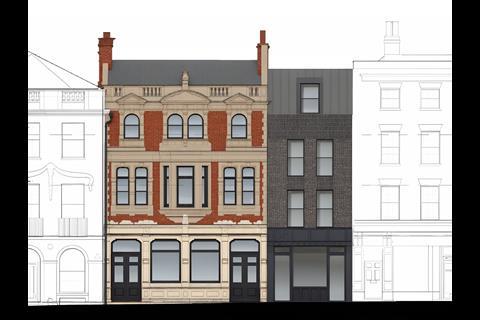 The design uses dark waterstruck brick and an oxidised copper shopfront to re-establish the rhythm of the High Street frontage.