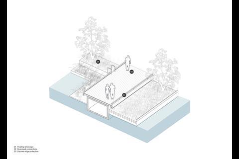 The floating concrete pontoons were designed and installed by Clement Systems, dealing with the complex dynamics of load distribution to achieve stability and buoyancy. They were preassembled adjacent to site and floated into place with much of the seating and planting already installed.