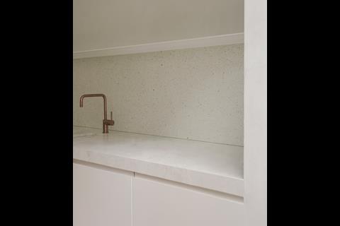 I think it has to be the Grey Cloud marble that forms the eight metre long kitchen worktop. The Mugla stone’s soft veining and cloudy surface lend a quiet elegance that grounds the interiors. The weighty edge profile establishes a strong visual anchor within the galley kitchen, balancing the delicateness of the pressed metal shelf above. The marble’s light grey clouding formations include faint hints of pinkish tones that help unite the finishes palette by complementing both the pale plastered walls and the rosy warmth of the Douglas Fir flooring.