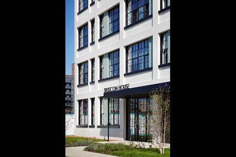 At the centre is Truscon House, the cluster’s anchor. We restored the Art Deco entrance tower and original Hennebique concrete frame, thermally upgrading the structure while leaving the historic fabric visible. New aluminium windows match the original Crittall profiles and layouts retain generous factory-scale ceiling heights, enabling dual-aspect homes with strong cross-ventilation.
