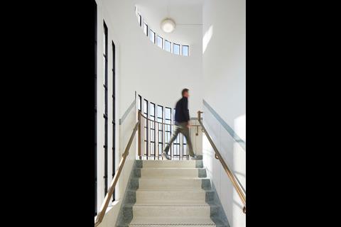 The green ceramic tiles by Alsecco and ABC-Keramik are a standout – both for their aesthetic character and the way they express the project’s design philosophy. They’re used on facades and at internal wall junctions, creating a crisp, legible interface between old and new. The colour, finish and grid all reference the Moderne detailing of the original canteen building, helping tie the ‘heritage cluster’ together visually and conceptually.