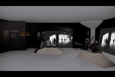 Woods Bagot said it had sought to channel both the undercroft’s monolithic architecture and the “creative spirit of the skateboarding scene” by allowing visitors to choose their own route through the exhibition.