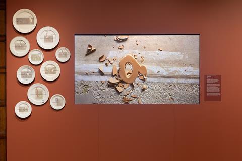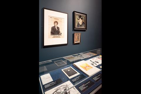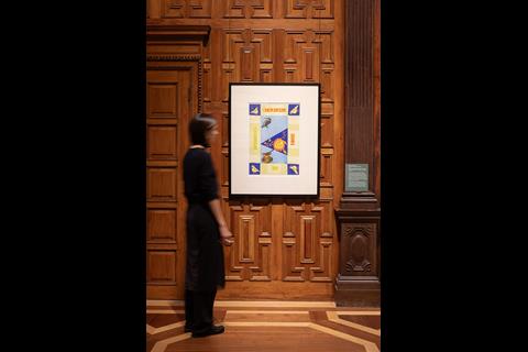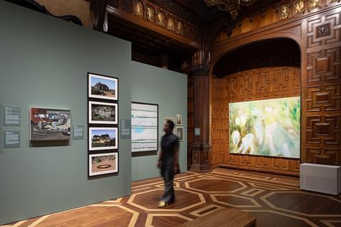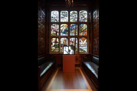 The exhibition continues upstairs in the former library, which has an unusual door. Two Temple Place’s director, Paddy Altern, points out that while the door is clearly legible on the public side in the adjacent Great Hall, it is concealed within the satinwood panels once we are inside the private space.