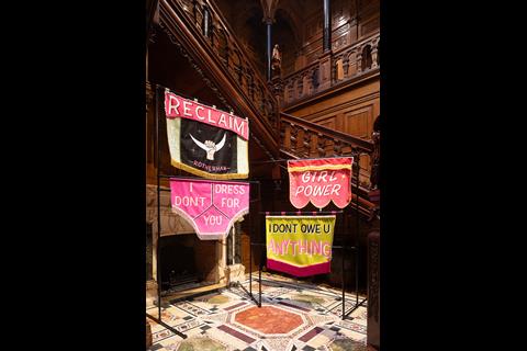 Alongside more reflective pieces, there is protest as resilience. At the foot of the staircase are brightly sewn ”Girl Power” and “I Don’t Dress for You” banners by Jenna Greenwood, comically offset by the mahogany carving of D’Artagnan, one of the Three Musketeers on the balustrade. Or forever Dogtanian, if you are over a certain age.