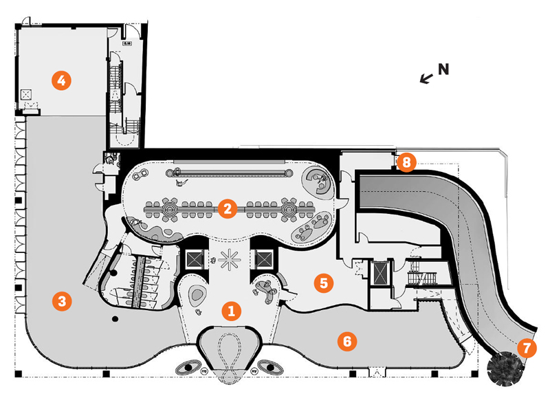 When it came to the interior planning, RHWL made sure it was conducive to Karim Rashid’s trademark curves and drama, especially in the ground floor plan. “Because our client had appointed an interior designer whose work is all about curved forms, we familiarised ourselves with Rashid’s aesthetic and worked with it, not against it,” says Monk. Public areas like the restaurant and café are pushed to prominent locations at the perimeter overlooking Jubilee Square and Jubilee Street respectively. The lifts are easily accessed in the main lobby close to reception, and back of house is kept to a minimum. That can’t be said of the crystals — Myhotel founder Andy Thrasyvoulou is keen on feng shui, and crystals pop up in every room and corridor.